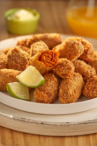 Frite em óleo quente até dourar. Outra opção é untar cada croquete com azeite em spray e assar na Airfryer pré-aquecida em temperatura alta por cerca de 10 a 15 minutos, ou até que estejam dourados.Molho de Qualy Vegê com limão: