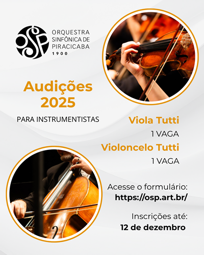 A Orquestra Sinfônica de Piracicaba (OSP) está com inscrições abertas para audição pública visando o preenchimento de duas vagas para a Temporada 2026. As vagas são para viola tutti e violoncelo tutti.