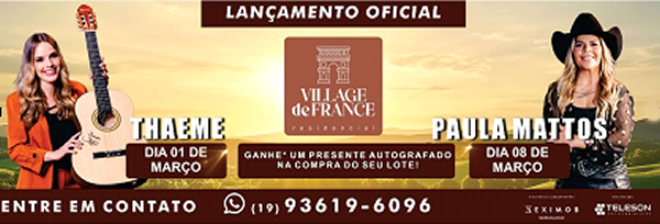 Enquanto o Brasil celebra o Carnaval, Amparo já se prepara para uma nova festa. No dia 1º de março, o distrito de Arcadas recebe o lançamento oficial do Village de France Residencial, empreendimento que une lazer, natureza e qualidade de vida em um só lugar. O evento contará com a presença especial da cantora Thaeme, da dupla Thaeme & Thiago, que realizará um pocket show exclusivo e participará de sessão de autógrafos destinada aos compradores.